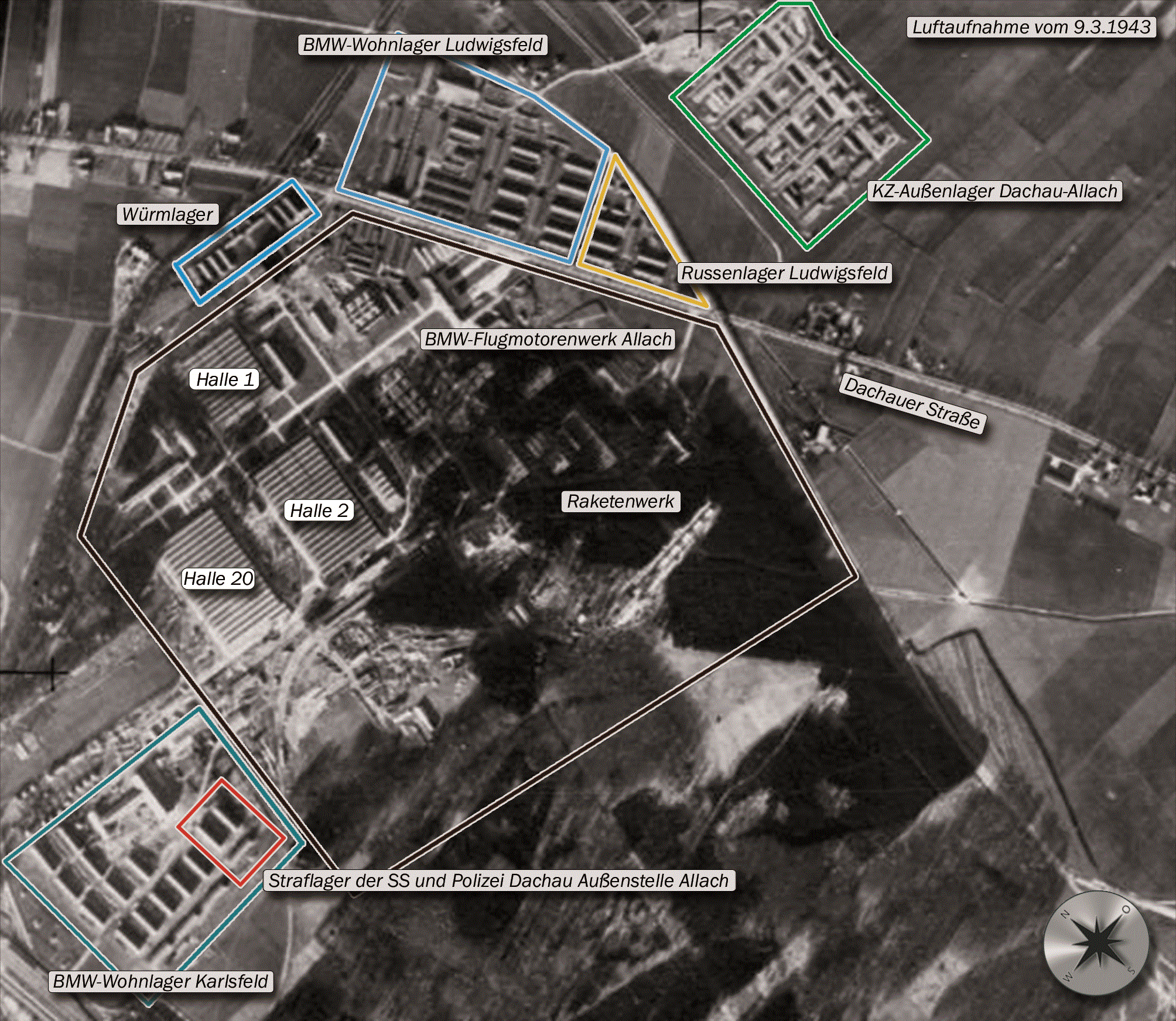 Das Luftbild zeigt das BMW-Flugmotorenwerk in Allach am 9. März 1943, die BMW-Wohnlager sowie das sich im Bau befindliche KZ-Außenlager Dachau-Allach (oben rechts grün umrandet). Innerhalb des „BMW-Wohnlagers Karlsfeld“ (türkis, Fassungsvermögen ca. 3.500 Bewohner) lag das „Straflager der SS und Polizei Dachau Außenstelle Allach“ (rot, Fassungsvermögen ca. 1.000 Häftlinge). Deutlich zu sehen: Das „Würmlager“ (blau, ca. 150 Bewohner), das „BMW-Wohnlager Ludwigsfeld“ (blau, ca. 1.500 Bewohner) und das KZ (grün, bis zu 6.500 Häftlinge). Das russische Kriegsgefangenenlager - „Russenlager“ (gelb) - an der Dachauer Straße war bis Mitte 1942 „einsatzfertig“ und im September 1944 mit 608 sowjetischen Kriegsgefangenen belegt. Das Großserienwerk (schwarz) mit drei Montagehallen (Halle 1, 2, 20) und 92 Motorprüfständen war betriebsfähig, die Produktion des 801-Motors seit Januar 1942 mit steigenden Stückzahlen angelaufen. Im Süden des Werksgeländes befanden sich eine kleine Gebäudezeile zur Raketenerprobung und -produktion im Bau. Für 1942 war von BMW für das Werk Allach ein Bedarf von 7.057 Facharbeitern an das Reichsluftfahrtministerium (RLM) gemeldet, jedoch nur knapp die Hälfte zugewiesen worden.