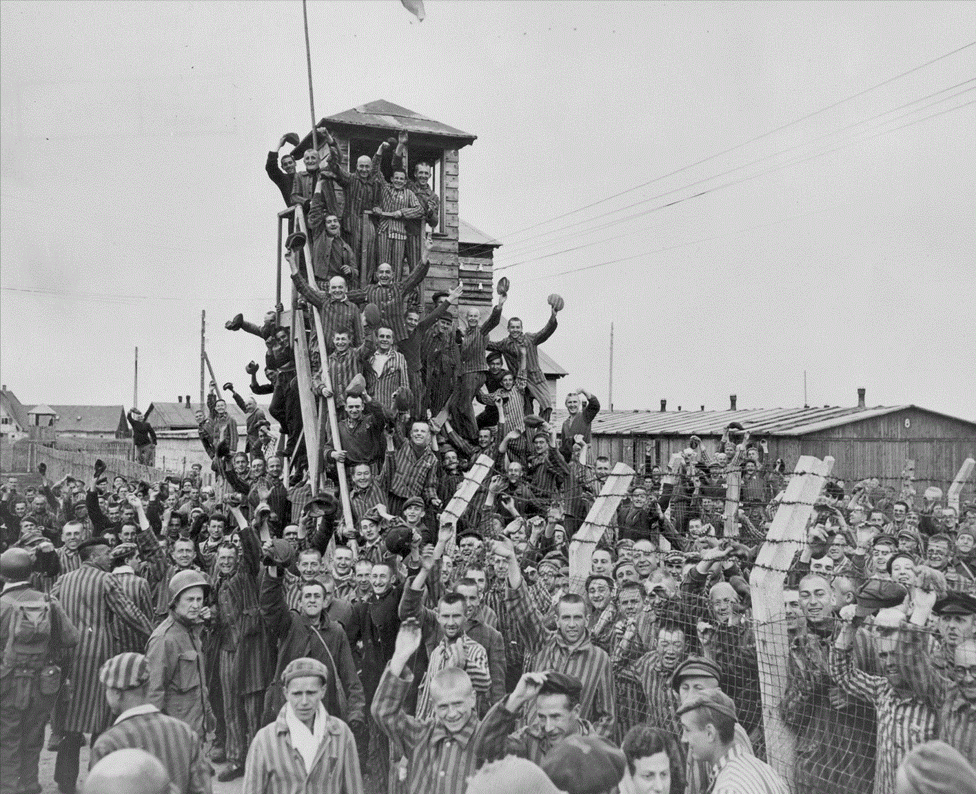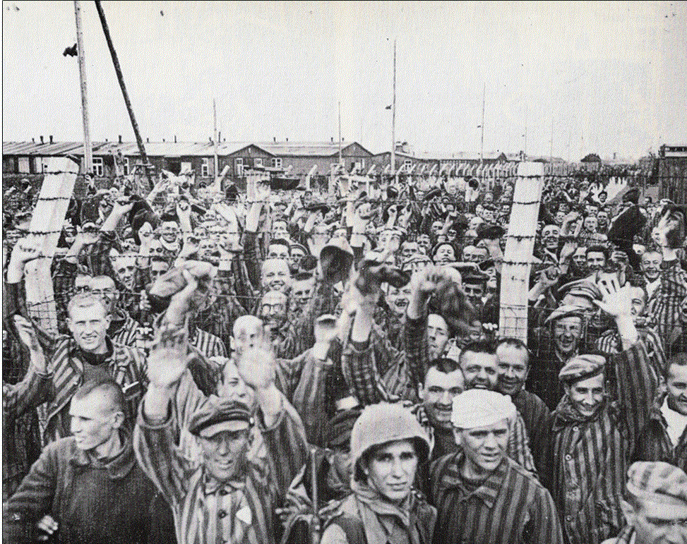 Alle "Befreiungsaufnahmen" sind gestellt und "Propagandaaufnahmen". Sie stammen vom 1. Mai 1945 - entstanden also 1 Tag nach der Befreiung - und "spielen die Befeiung" nach, vermitteln dennoch nicht nur einen räumlichen Eindruck. Die Freude darüber war sicher echt.