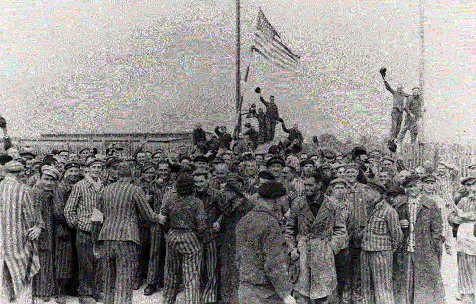 jetzt sind da Männer, die wie Verrückte durch das Lager laufen... Sie zeigen mit den Fingern auf ein khakifarbenes Gewimmel: Soldaten, halb gebückt, halb kriechend, unter der nahen Eisenbahnbrücke (...) Sie stehen auf, kommen aus dem Schatten, breiten sich in Schützenlinie aus, die Gruppe kommt im Laufschritt auf das Lager zu. Ein amerikanisches Freikorps (...) Ein einziger Schrei: ‚Da sind sie! (...) Da sind sie! (...)‘ Es ist wie ein Rausch vor den Blocks (...) Es wird gelacht, geweint, umarmt (...) Man umarmt die Befreier, umringt sie so, dass sie fast ersticken. Jeder will sie anfassen, um sicher zu gehen, dass er nicht träumt. Es sind fast noch Kinder, die sich jetzt sprachlos anschauen und mit weit aufgerissenen Augen auf diese unbeweglichen Haufen